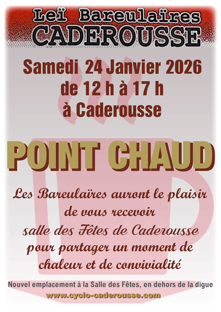Réussite pour notre point-chaud du 20 janvier 2024. 130 pédaleurs dont 21 féminines venus de quatre départements ont bravé les froides températures de cette fin janvier. Le soleil était tout de même au rendez-vous et le Mistral a eu la gentillesse de se calmer…